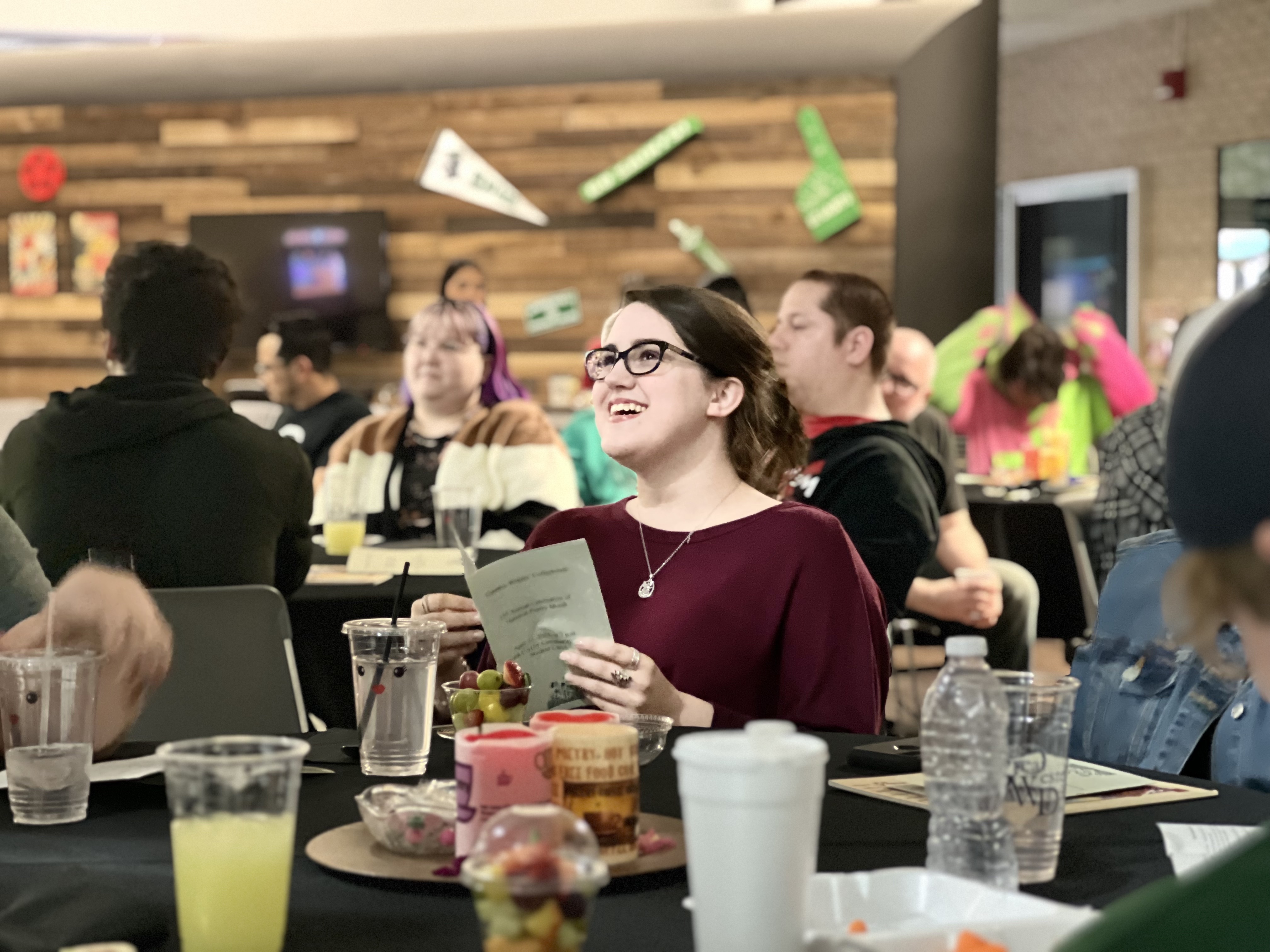 SCCC employee Maddy Sander laughs as she listens to the spoken-word performances featured at the Creative Writers’ Coffeehouse Friday evening.